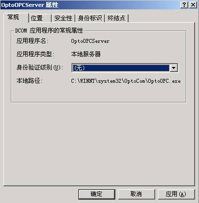 這時會彈出“OptoOPCServer屬性”對話框。在該對話框的“常規(guī)”標(biāo)簽頁內(nèi)選擇“身份驗證級別”為:無。