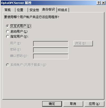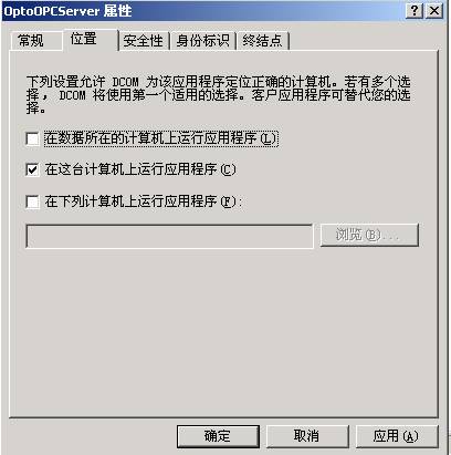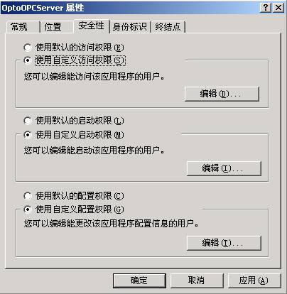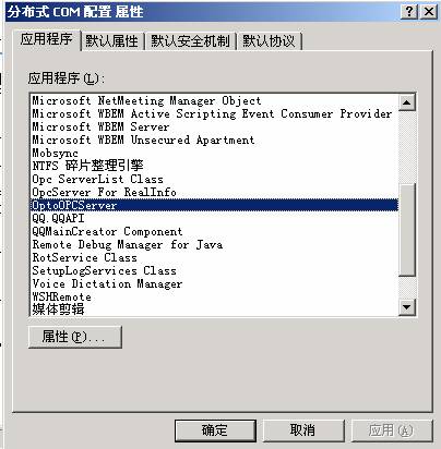 在“分布式COM配置屬性”對話框內(nèi)選擇“應(yīng)用程序”標(biāo)簽,選擇其下的OptoOPCServer項,并選擇“屬性”按鈕。