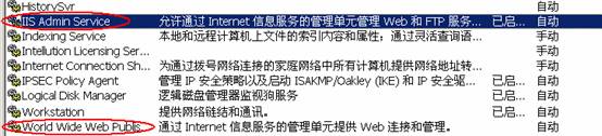應(yīng)該可以在服務(wù)中看到IIS Admin Service和World Wide Web Publis兩個(gè)項(xiàng)目。如果沒(méi)有這兩個(gè)選項(xiàng),說(shuō)明IIS安裝有誤,請(qǐng)重新安裝IIS。同時(shí)請(qǐng)保證這兩個(gè)服務(wù)的啟動(dòng)類別處在自動(dòng)方式。具體請(qǐng)參考上圖。
