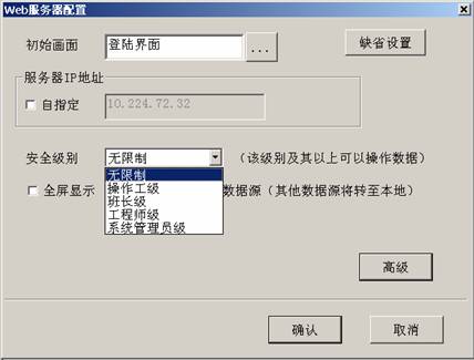 安全級(jí)別:此參數(shù)主要是為了增加Internet/Intranet上遠(yuǎn)程操作的安全性,當(dāng)IE的用戶級(jí)別等于或高于這個(gè)級(jí)別才能執(zhí)行遠(yuǎn)程操作。如果指定了安全級(jí)別,操作發(fā)布后的工程畫面必須先登錄。