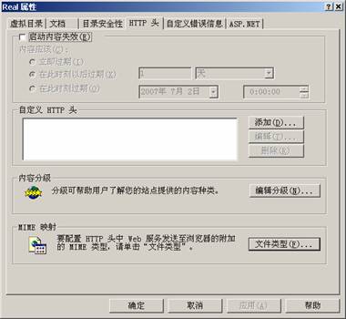 如果此時(shí)仍無(wú)法進(jìn)行Web訪問(wèn),請(qǐng)檢查IIS的版本,如果IIS的版本如果是IIS6(2003Server一般是IIS6),請(qǐng)打開(kāi)您設(shè)置好的的虛擬目錄或默認(rèn)Web站點(diǎn)的屬性框,選擇HTTP頭頁(yè),如下圖所示: