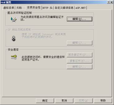 請(qǐng)打開(kāi)默認(rèn)Web站點(diǎn)的屬性框,選擇“目錄安全性”頁(yè),如下圖所示: