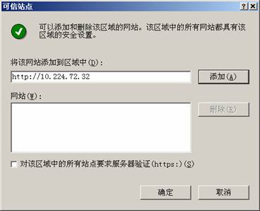 如果仍然無(wú)法通過(guò)Web訪問(wèn)流程圖畫面,請(qǐng)?jiān)凇癐nternet選項(xiàng)”的“安全”頁(yè)中選擇“受信任的站點(diǎn)”項(xiàng),如下圖所示,把服務(wù)器的IP地址添加為信任站點(diǎn)。需要注意的是,請(qǐng)不要選中“對(duì)該區(qū)域中的所有站點(diǎn)要求服務(wù)器驗(yàn)證”項(xiàng)。