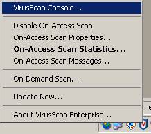 在圖標(biāo)上點(diǎn)擊鼠標(biāo)右鍵,在彈出的快捷菜單上選擇“VirusScan Console…”項(xiàng),運(yùn)行VirusScan Console。