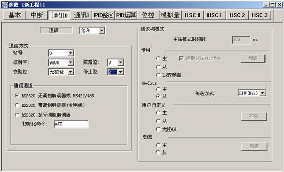 選擇“通訊0”屬性頁,將“通訊”設(shè)置為“允許”,站號設(shè)置為”0”, 通訊參數(shù)設(shè)置定9600,8,無,2 ,通訊方式選擇RS232C無調(diào)制解調(diào)器或RS422/485,協(xié)議模式選擇Modbus RTU Slave 方式,同時將“通訊1” 屬性頁中的“通訊”設(shè)置為“禁止”。