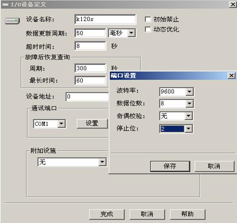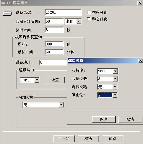 雙擊MODBUS下的“串行口通訊”彈出I/O 設(shè)備定義對話框,具體設(shè)置如圖6所示,點擊“下一步”按鈕,將彈出MODBUS設(shè)備定義對話框,具體設(shè)置如圖7所示 ,最后點擊“完成”按鈕,完成I/O設(shè)備的定義。
