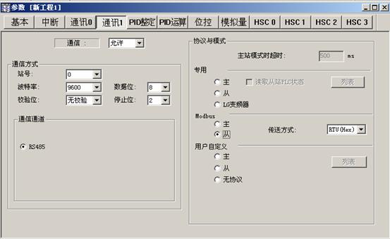 將“通訊0”屬性頁中的“通訊”設(shè)置為“禁止”,站號設(shè)置為”0”, 通訊參數(shù)設(shè)置定9600,8,無,2 ,通訊方式選擇RS485,協(xié)議模式選擇Modbus RTU Slave 方式。