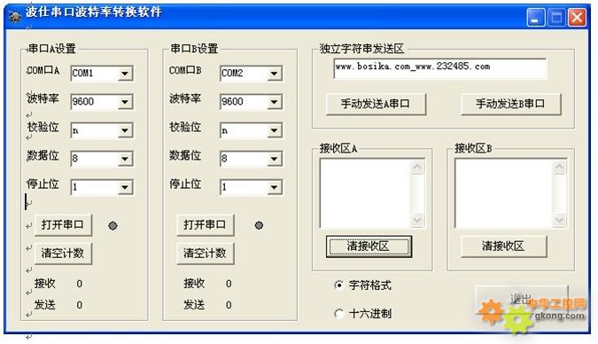 串口波特率轉(zhuǎn)換軟件的界面右邊為測試和檢測部分,正常工作時不需要操作。按“手動發(fā)送A串口”可以測試串口A的設(shè)置是否生效,是否可以正確與設(shè)備1通信,接收到的數(shù)據(jù)顯示在“接收區(qū)A”框內(nèi)。串口B的部分是同樣的功能。右下角有“字符格式”和“十六進制”的選項,默認為“字符格式”。當(dāng)選擇“十六進制”時,本軟件可以實現(xiàn)16進制數(shù)據(jù)的格式轉(zhuǎn)換,特別適合MODBUS等工控軟件。