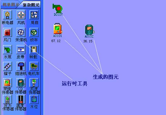 運(yùn)行時(shí)手工添加的圖形對(duì)象,在組態(tài)時(shí)要預(yù)先繪制好,并加入到工具畫(huà)面中。運(yùn)行時(shí)通過(guò)拖拽方式將其繪制到相應(yīng)的畫(huà)面,然后修改其關(guān)聯(lián)變量等操作,最后保存到服務(wù)器,實(shí)現(xiàn)動(dòng)態(tài)添加圖形對(duì)象的操作。