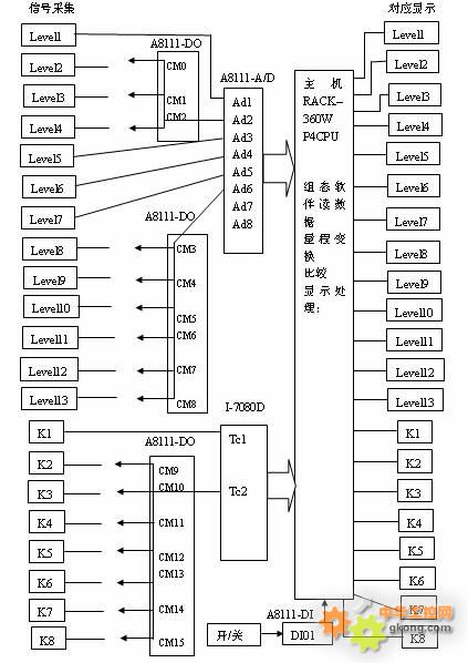 首先考慮測(cè)試系統(tǒng)的一是價(jià)格要低,二是可用性要強(qiáng)。將電路板的信號(hào)源做了一些處理,信號(hào)輸出范圍變成標(biāo)準(zhǔn)信號(hào)輸出。被測(cè)電路板的信號(hào)輸出情況,電壓信號(hào)有13路其中3路5V電壓6路26V電壓相同,頻率信號(hào)有8路其中7路的頻率相同。采集部分采用一塊8通道12位30KS/S ISA多功能卡A8111和一塊2通道的I-7080D計(jì)數(shù)模塊來(lái)完成信號(hào)采集功能。充分利用A8111上的16路數(shù)字輸出繼電器的開(kāi)關(guān)功能,讓Ad2、Ad6、Tc2三個(gè)通道通過(guò)輸出繼電器的開(kāi)關(guān)輪流接通Level2-4、Level8-13、K2-8。