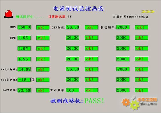 ①組態(tài)軟件與采集卡和模塊通過(guò)I/O Server實(shí)時(shí)通訊交互數(shù)據(jù),當(dāng)電路板準(zhǔn)備就緒后,按動(dòng)一下開(kāi)始檢測(cè)按鈕開(kāi)始檢測(cè)。當(dāng)系統(tǒng)接受到測(cè)試指示后,經(jīng)過(guò)組態(tài)軟件循環(huán)腳本程序的處理,讓Ad2、Ad6、Tc2三個(gè)通道通過(guò)輸出繼電器的開(kāi)關(guān)輪流接通Level2-4、Level8-13、K2-8。將Ad2、Ad6、Tc2三個(gè)需要輪流測(cè)量的通道同時(shí)輪流,每一個(gè)點(diǎn)的輪流時(shí)間可以控制在0.5秒,最多的7個(gè)點(diǎn)循環(huán)3.5秒,這樣一整個(gè)測(cè)試周期就可以用不到10秒的時(shí)間完成,將被測(cè)線(xiàn)路板的各類(lèi)電壓值和頻率值分別顯示在軟件當(dāng)中,達(dá)到功能測(cè)試目的。所有采集到的數(shù)值都有一相對(duì)應(yīng)的標(biāo)準(zhǔn)值,對(duì)應(yīng)的采集到的數(shù)據(jù)與標(biāo)準(zhǔn)值進(jìn)行比較,如所有數(shù)值都在他相對(duì)應(yīng)的標(biāo)準(zhǔn)值的范圍內(nèi),就報(bào)告通過(guò)顯示“PASS”,再做下一張板測(cè)試,如果有個(gè)別參數(shù)有誤,會(huì)在相應(yīng)的參數(shù)后面提示“ERROR”,便于工作人沒(méi)進(jìn)對(duì)相應(yīng)的錯(cuò)誤做處理。每次將測(cè)試結(jié)果保存到軟件的內(nèi)置數(shù)據(jù)表(二維表)當(dāng)中,便于以后統(tǒng)計(jì)管理。