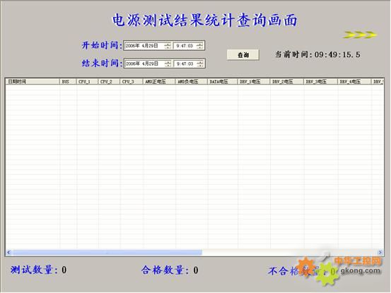 當(dāng)系統(tǒng)完成一塊電路板的測(cè)試后,將被測(cè)電路板的所有數(shù)據(jù)保存起來(lái),方便以后查詢(xún)統(tǒng)計(jì)。我們可以根據(jù)時(shí)間來(lái)查詢(xún),在畫(huà)面中輸入開(kāi)始時(shí)間和結(jié)束時(shí)間(年、月、日、時(shí)、分),系統(tǒng)會(huì)將這段時(shí)間測(cè)試情況顯示出來(lái),測(cè)試總數(shù)、合格數(shù)量、不合格數(shù)量,每塊已測(cè)電路板的所有參數(shù)數(shù)據(jù)全部統(tǒng)計(jì)出來(lái)。如下圖: