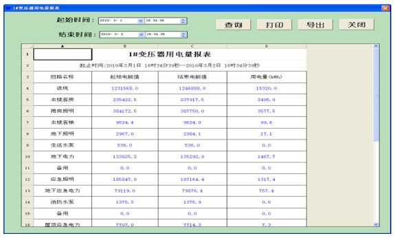 此電能報表支持手動輸入時間查詢?nèi)魏螘r段和任何回路的耗電量。同一變壓器下的出線回路安排在同一個電能報表內(nèi),便于管理人員的統(tǒng)計管理。系類報表可設(shè)計成用戶慣用的電能報表格式,以延續(xù)工作人員的工作風(fēng)格。