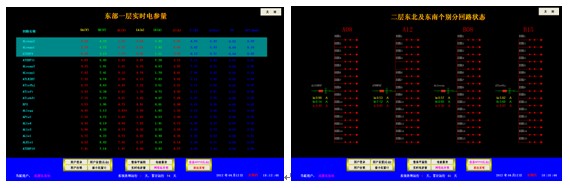 登陸普通權(quán)限用戶,通過主界面的操作,即可以查看各個區(qū)域運(yùn)行的電參量(電流、電壓、有功、無功、功率因數(shù)、電度、),對各個回路的分合閘狀態(tài)通過回路數(shù)據(jù)顏色變化來顯示出來(紅色代表合閘、綠色代表分閘)。同時各個回路都支持曲線查詢功能,通過該界面的操作即可查詢每一路的電流趨勢曲線。