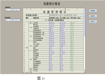 對(duì)信號(hào)采集系統(tǒng)所采集實(shí)時(shí)數(shù)據(jù)進(jìn)行統(tǒng)計(jì)、分析、計(jì)算,將數(shù)據(jù)進(jìn)行定時(shí)存儲(chǔ)。并通過計(jì)算產(chǎn)生每日/周/月/年用電量;每日/周/月/年最大負(fù)荷及最大負(fù)荷出現(xiàn)時(shí)間,對(duì)存在故障隱患的設(shè)備及時(shí)提出整改;通過電能分時(shí)計(jì)量累計(jì)電費(fèi),對(duì)不合理用電單位提出科學(xué)合理的改進(jìn);通過邏輯運(yùn)算計(jì)算出設(shè)備正常、異常出現(xiàn)次數(shù),存儲(chǔ)事故發(fā)生時(shí)間、原因。電能報(bào)表如圖2所示: