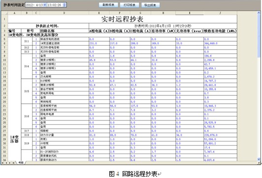 系統(tǒng)對(duì)所有采集到的數(shù)據(jù)都能實(shí)時(shí)的顯示,并保存到數(shù)據(jù)庫(kù)中,因此可以手動(dòng)查詢每個(gè)回路的所有實(shí)時(shí)及歷史電參量數(shù)據(jù),并以表格的形式展現(xiàn)給用戶,便于打印、保存。如圖4所示。