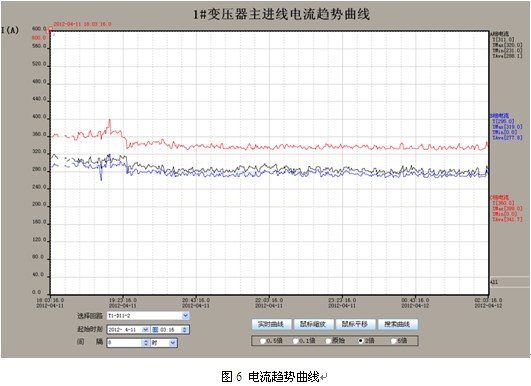 本系統(tǒng)對(duì)于重要回路,不僅可以對(duì)電流進(jìn)行實(shí)時(shí)顯示與監(jiān)測(cè),并可以根據(jù)保存的歷史數(shù)據(jù)做成趨勢(shì)曲線,可以查看實(shí)時(shí)和歷史變化趨勢(shì),預(yù)測(cè)電力負(fù)荷容量,并可對(duì)電力故障進(jìn)行查詢,保證電力負(fù)荷的安全運(yùn)行。如圖6所示。