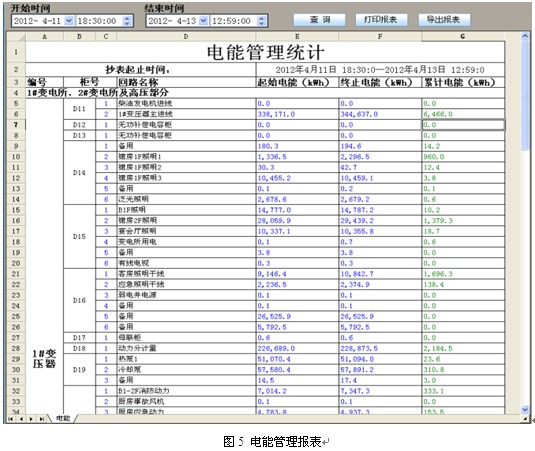 系統(tǒng)采集的有功電度數(shù)據(jù),按照回路名稱的不同,自動(dòng)生成日?qǐng)?bào)表、月報(bào)表和年報(bào)表并有報(bào)表打印功能,并可對(duì)某一回路的某一時(shí)間段內(nèi)的用電量進(jìn)行查詢與打印,同時(shí)這些報(bào)表也能以Excel的格式導(dǎo)出。如圖5所示。