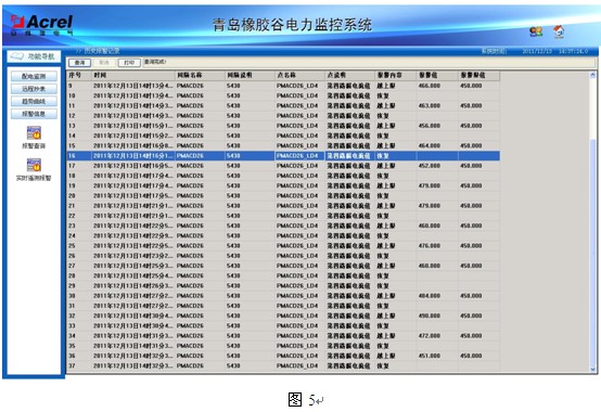 4.4事故報警和追憶:電力監(jiān)控系統(tǒng)定義了所有配電回路過負(fù)荷、低壓回路剩余電流過大及10kV回路開關(guān)量變位實時報警和歷史報警查詢等功能,如圖5所示,列表中列出報警發(fā)生和恢復(fù)的時間、回路名稱、回路編號、數(shù)據(jù)點、報警內(nèi)容和報警值等數(shù)據(jù),可見某些回路剩余電流值超標(biāo)較嚴(yán)重。