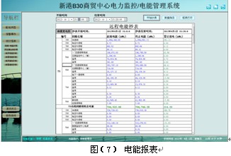 用電量報表功能,可選擇時間段進行查詢,支持任意時間段電度累計查詢,具備數(shù)據(jù)導出和報表打印等功能。為用戶提供了精確可靠的電能報表。如下圖所示,顯示美羅商城某段時間內(nèi)的各配電回路的精確用電量,用戶可以直接打印報表,可以以EXCEL格式另存到其他位置。見圖(7)。