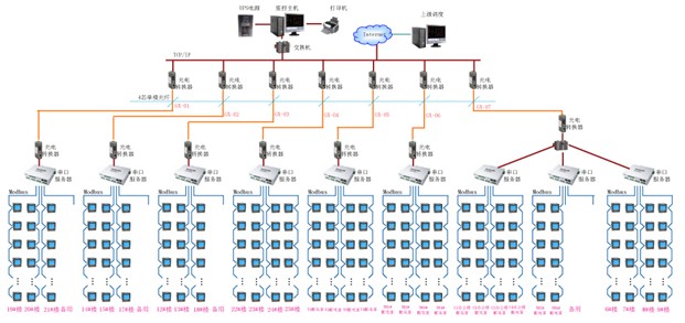 對上海金陵金橋工業(yè)園區(qū)管理方提出的需求和我們確定的組網(wǎng)方案,站控管理層設(shè)備層采購華北工控的工業(yè)主機,三星19寸顯示器,SANTAK的UPS;網(wǎng)絡(luò)通訊層使用MOXA的NPORT5630-8串口服務(wù)器和MS1102的光電轉(zhuǎn)換器以及3C16470的網(wǎng)絡(luò)交換機;現(xiàn)場設(shè)備層采用安科瑞公司PZ96-E4系列網(wǎng)絡(luò)電力儀表,總線鋪設(shè)屏蔽雙絞線,以滿足系統(tǒng)組網(wǎng)的要求。