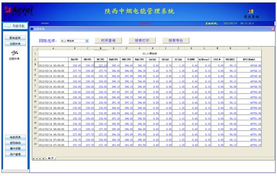 4.2. 遠(yuǎn)程抄表查詢:各個(gè)配電室各個(gè)回路按照時(shí)間段進(jìn)行歷史數(shù)據(jù)查詢。選擇回路后,可選擇時(shí)間間隔、時(shí)間長度對(duì)該回路進(jìn)行歷史數(shù)據(jù)精確查詢,包括電壓、電流、功率、功率因數(shù)和電能等常用數(shù)據(jù)。查詢結(jié)果可導(dǎo)出成EXCEL表格進(jìn)行保存,也可打印保存