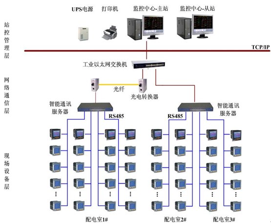 廠區(qū)配電中心提供一套電能管理系統(tǒng),雙機同步顯示;將廠區(qū)各變壓器的主進線柜、出線柜、各低壓回路配多功能智能儀表,接至監(jiān)控后臺。系統(tǒng)能監(jiān)控分時計量尖峰、峰、平、谷電量;實時測量相電壓、線電壓、有功功率、無功功率、視在功率、功率因數(shù)、頻率等數(shù)據(jù),能打印月度用電報表,并有歷史曲線的查詢(時間不小于30天)。各參數(shù)及數(shù)據(jù)通過網(wǎng)絡(luò)送至配電中心的電工值班室(后臺監(jiān)控中心)。