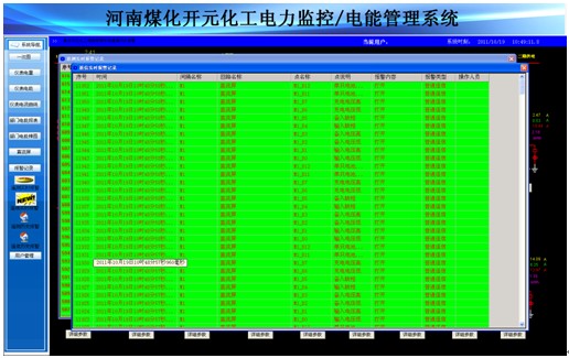 報警菜單欄下有4個功能按鈕,分別為實時遙測量報警、歷史遙測報警信息、實時遙信報警,歷史遙信報警信息。具備實時報警信息和歷史報警信息查詢功能。報警界面內(nèi)提示的內(nèi)容包括報警時間、回路名稱、報警內(nèi)容、報警限值以及當值人員等。