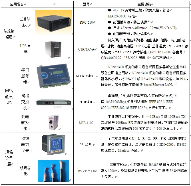對中化平原化工有限公司提出的需求和我們確定的組網(wǎng)方案,站控管理層設備層采購華北工控的工業(yè)主機,聯(lián)想的顯示器,SANTAK的UPS以及HP的打印機;網(wǎng)絡通訊層使用MOXA的NPORT5430I串口服務器,華為3C16470網(wǎng)絡交換機;現(xiàn)場設備層采上海安科瑞公司PZ80系列網(wǎng)絡電力儀表,總線鋪設屏蔽雙絞線,以滿足系統(tǒng)組網(wǎng)的要求,具體設備如下表: