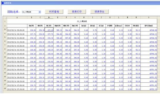4.2. 遠程抄表查詢:各個配電室各個回路按照時間段進行歷史數(shù)據(jù)查詢。選擇回路后,可選擇時間間隔、時間長度對該回路進行歷史數(shù)據(jù)精確查詢,包括電壓、電流、功率、功率因數(shù)和電能等常用數(shù)據(jù)。查詢結(jié)果可導出成EXCEL表格進行保存,也可打印保存