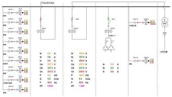 4.1. 一次圖顯示:ACREL-2000軟件通過中間采集設備采集現(xiàn)場電力監(jiān)控儀表數(shù)據(jù),并在系統(tǒng)一次圖顯示出來。如下圖所示,各個回路三相電流、三相電壓、有功功率、無功功率、功率因數(shù)、有功電能等電參量實時刷新顯示,能直觀反映該系統(tǒng)各進出線回路運行狀況。