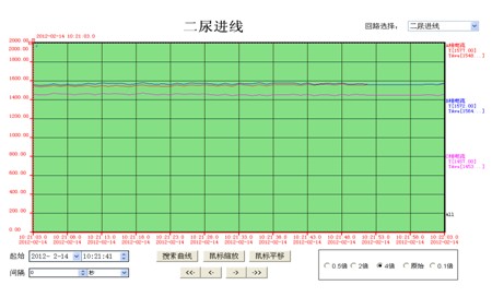 4.3趨勢曲線:各重要回路電流、功率實時趨勢顯示及歷史趨勢查詢功能。選擇回路后,該回路實時趨勢曲線會不斷刷新,選擇“起始時間”可查看該回路歷史趨勢曲線,選擇“時間長度”可查看歷史日、月、年趨勢曲線,能更加直觀反映該回路運行情況。