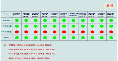 顯示高壓各回路遙信狀態(tài),通過畫面顏色的變化(紅色表示合閘狀態(tài)、綠色表示分閘狀態(tài)、灰色表示手車分離狀態(tài))可以看到現(xiàn)場斷路器運行狀態(tài)、手車位置、接地刀閘狀態(tài)、彈簧儲能狀態(tài)等。