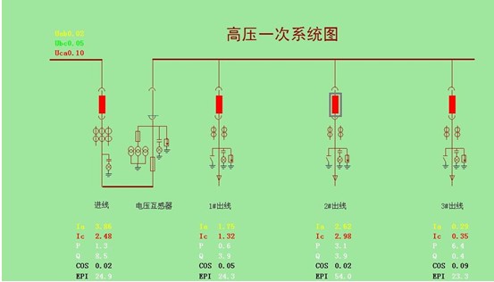實(shí)時(shí)顯示:生產(chǎn)配電室宿舍配電室各饋線回路電壓、電流、功率、功率因數(shù)及頻率等監(jiān)測信息實(shí)時(shí)刷新,配電室整體一次圖形式直觀動(dòng)態(tài)顯示;