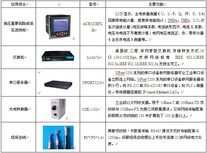 對(duì)山東電力管道工程公司提出的需求和我們確定的組網(wǎng)方案,現(xiàn)場設(shè)備層采購安科瑞公司ACR320網(wǎng)絡(luò)電力儀表,網(wǎng)絡(luò)通訊層使用華為的33c16470的網(wǎng)絡(luò)交換機(jī)以及MIE-1102光電轉(zhuǎn)換器,現(xiàn)場總線鋪設(shè)屏蔽雙絞線,以滿足系統(tǒng)組網(wǎng)的要求,具體設(shè)備如下表: