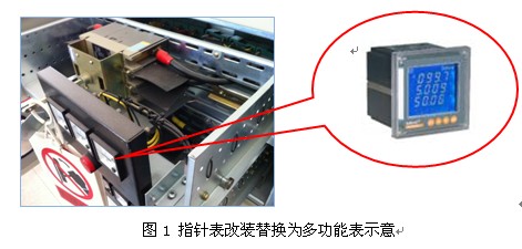 原安裝儀表為機(jī)械式指針表,重新改裝多功能網(wǎng)絡(luò)電力儀表。儀表取信號(hào)為:輔助電源(AC220V)取自當(dāng)前抽屜內(nèi)開關(guān)上端A相電壓;測(cè)量電壓信號(hào)取自當(dāng)前抽屜內(nèi)開關(guān)下端各相電壓;電流信號(hào)取自電流互感器電流二次輸出信號(hào)。通訊組網(wǎng)為采用屏蔽雙絞線將現(xiàn)場(chǎng)22只儀表以手拉手的總線型方式直接引致后臺(tái)監(jiān)控主機(jī),為保證通訊可靠性及防浪涌保護(hù),于主機(jī)端加裝通訊轉(zhuǎn)換隔離器進(jìn)行保護(hù)。儀表改裝如圖1所示。