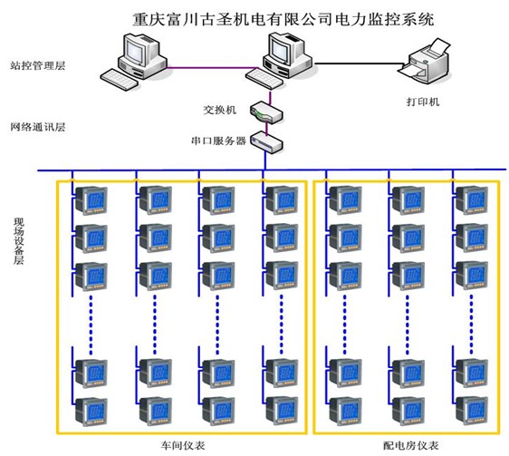 系統(tǒng)硬件方面:站控管理層采用一臺(tái)工控機(jī)和一臺(tái)打印機(jī);通訊層設(shè)備采用一個(gè)16口串口服務(wù)器,因?yàn)橐娃k公網(wǎng)絡(luò)連接,所以再配一個(gè)4口的網(wǎng)絡(luò)交換機(jī)。底層的現(xiàn)場(chǎng)設(shè)備,該項(xiàng)目主要需要實(shí)現(xiàn)的功能是常用電參量的采集和歷史數(shù)據(jù)查詢。安科瑞電氣的PZ系列多功能表,是針對(duì)電力系統(tǒng),工礦企業(yè),公用設(shè)施,智能大廈的電力監(jiān)控需求而設(shè)計(jì)的儀表。它能測(cè)量常用電力參數(shù),如三相電壓、電流、諧波電壓、諧波電流、諧波電壓百分量、諧波電流百分量、有功功率、無功功率、頻率、功率因數(shù)、有(無)功電能,并能顯示日期時(shí)間。由于該電力儀表還具備完善的通信聯(lián)網(wǎng)功能和各種擴(kuò)展功能(如:開關(guān)量輸入、輸出)。它非常適合于實(shí)時(shí)電力監(jiān)控系統(tǒng)。所以上海安科瑞電氣股份有限公司PZ系列中的PZ80智能電測(cè)儀表即可滿足儀表方面的要求。