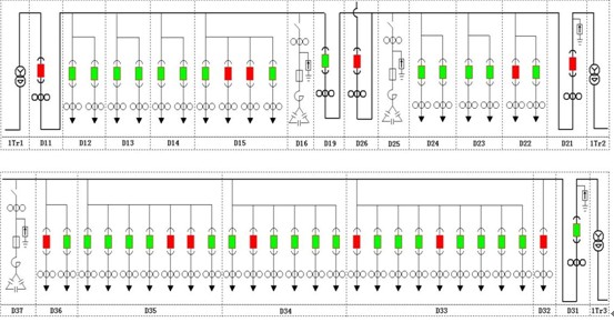 整個(gè)低壓配電系統(tǒng)包括20個(gè)低壓配電柜。其中三個(gè)進(jìn)線柜,三個(gè)電容補(bǔ)償柜,兩個(gè)母聯(lián)和12個(gè)出線柜。12個(gè)出線回路的負(fù)載基本上是三相大功率電機(jī)。