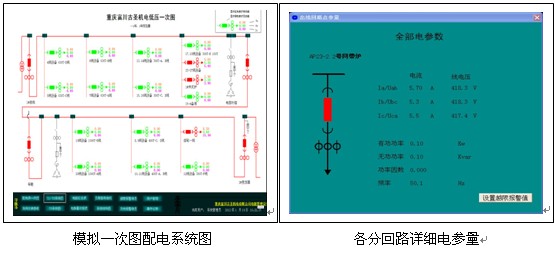 模擬一次圖配電系統(tǒng)圖從圖上可以直接看出該具體回路的合分閘情況,綠色表示分閘,紅色表示合閘。鼠標(biāo)左鍵點(diǎn)擊某個(gè)具體的一次回路時(shí),監(jiān)控軟件將彈出該回路的詳細(xì)電參量。