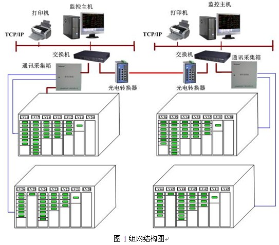 1#和2#配電室通過(guò)一根單模四芯光纖互聯(lián)組成局域網(wǎng),配合安科瑞公司Acrel-2000組態(tài)軟件的WEB發(fā)布功能,實(shí)現(xiàn)互相瀏覽彼此配電室的電力監(jiān)控畫(huà)面,系統(tǒng)組網(wǎng)畫(huà)面如下: