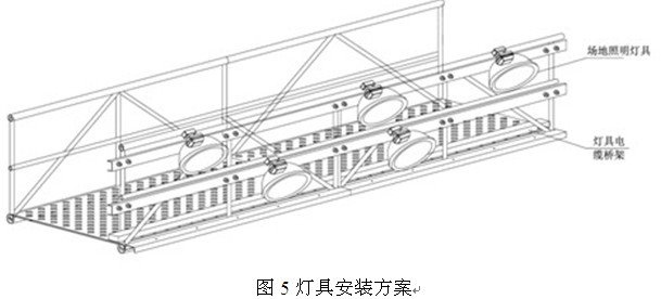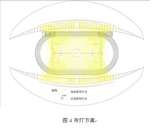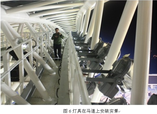 通過(guò)按照不同的配光曲線組合,按光衰周期開啟不同數(shù)量的燈具,實(shí)現(xiàn)等照度控制,以節(jié)約電能,比較結(jié)果如圖3所示。按初始光通量100%到維持光通量70%進(jìn)行計(jì)算共3 000 h,從初始光通量每5%(即每500 h),分五級(jí)模式照明,設(shè)置開燈模式進(jìn)行控制,同時(shí)電力監(jiān)控系統(tǒng)對(duì)毎盞燈的開燈時(shí)間進(jìn)行記錄,按最優(yōu)方式控制毎盞燈的總開燈時(shí)間,做到480盞燈具壽命同期,避免傳統(tǒng)的賽場(chǎng)照明控制方式使個(gè)別燈組的燈具開燈時(shí)間過(guò)長(zhǎng),提前老化,延長(zhǎng)了賽場(chǎng)照明的整體換燈周期,布燈方案如圖4所示。為保證恒照度模式下的賽場(chǎng)照明均勻度,照明設(shè)計(jì)軟件進(jìn)行了大量的模擬計(jì)算,優(yōu)化出最佳的燈具組合,同時(shí)設(shè)置要求在毎盞燈上配置對(duì)光裝置,可按方便地調(diào)整毎盞燈的靶心,以保證賽場(chǎng)的照度均勻。燈具安裝如圖5、圖6所示。