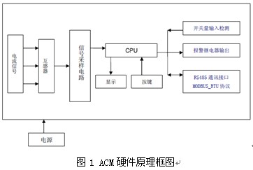ACM配電線路過負(fù)荷監(jiān)控裝置,采用最新的32位單片機(jī)技術(shù),具有抗干擾能力強(qiáng),工作穩(wěn)定可靠、數(shù)字化、網(wǎng)絡(luò)化等特點(diǎn)。通過檢測線路的電流,實(shí)現(xiàn)配電回路的兩段式報(bào)警。該監(jiān)控裝置可具有電流、電壓、有功功率、無功功率、視在功率、功率因數(shù)、漏電流測量功能、電流2~15次諧波分析功能、內(nèi)置蜂鳴器、指示燈報(bào)警功能、報(bào)警事件記錄、RS485 Modbus-RTU、Profibus-DP協(xié)議通訊接口、開關(guān)量輸入、可編程繼電器輸出、DC4~20mA模擬量輸出等功能,方便與PLC、工控機(jī)等工控設(shè)備組成網(wǎng)絡(luò),實(shí)現(xiàn)線路運(yùn)行的遠(yuǎn)程監(jiān)控。監(jiān)控裝置硬件原理框圖如圖1所示。