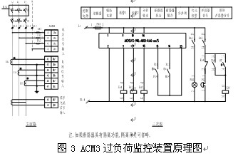 圖3為ACM配電線路監(jiān)控裝置的原理圖。在此圖中,ACM監(jiān)控裝置和塑殼斷路器配合使用的,塑殼斷路器有單磁和熱磁兩種,單磁斷路器只具有短路保護(hù)功能,無熱過載保護(hù),在這種情況下,線路中如有過載現(xiàn)象,斷路器不會(huì)動(dòng)作,ACM監(jiān)控裝置會(huì)根據(jù)不同過載程度分別發(fā)出報(bào)警信號,提醒現(xiàn)場維護(hù)人員,也可遠(yuǎn)傳至控制中心。熱磁塑殼斷路器既具有短路保護(hù)又具有熱過載保護(hù),此時(shí),ACM監(jiān)控裝置僅可作為報(bào)警功能作用,當(dāng)檢測到電流達(dá)到設(shè)定閾值后,內(nèi)部繼電器動(dòng)作。