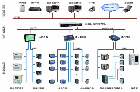 Acrel-2000電力監(jiān)控系統(tǒng)是基于10kV及以下變配電系統(tǒng)的監(jiān)測與管理,該系統(tǒng)由管理層(站控層)、通信層(中間層)、間隔層(現(xiàn)場監(jiān)控層)三部分組成,見下圖。