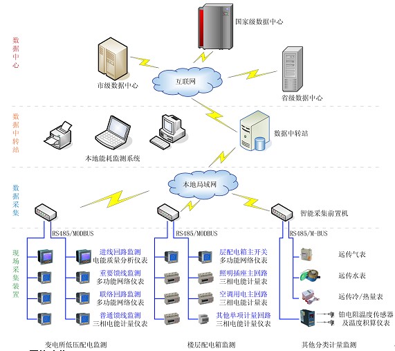 能耗分析管理系統(tǒng)是指通過對國家機(jī)關(guān)辦公建筑和大型公共建筑安裝分類和分項能耗計量裝置,采用遠(yuǎn)程傳輸?shù)仁侄渭皶r采集能耗數(shù)據(jù),實現(xiàn)重點建筑能耗的在線監(jiān)測和動態(tài)分析功能的硬件系統(tǒng)和軟件系統(tǒng)的統(tǒng)稱。其中,分類能耗是指根據(jù)國家機(jī)關(guān)辦公建筑和大型公共建筑消耗的主要能源種類劃分進(jìn)行采集和整理的能耗數(shù)據(jù),如:電、燃?xì)、水等。分項能耗是指根?jù)各類能源的主要用途劃分進(jìn)行采集和整理的能耗數(shù)據(jù),例如,電量分項能耗應(yīng)當(dāng)包括:照明插座用電、空調(diào)用電、動力用電、特殊用電。