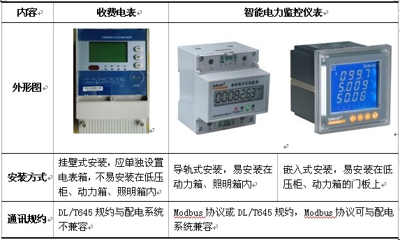 大型公共建筑電能計量宜采用電力儀表作為內(nèi)部管理電表,不宜用收費(fèi)電表。兩者主要特點歸納如下(見表1)。
