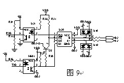 通訊方式采用RS485方式,使用高速光耦實現(xiàn)電氣隔離,由于 485接口芯片U20是半雙工結(jié)構(gòu),本電路的特點是由發(fā)送數(shù)據(jù)控制485芯片的發(fā)送和接收,實現(xiàn)了自動數(shù)據(jù)流控制,省略了一個流控制光耦,簡化了軟硬件設計。降低了成本。(圖9)