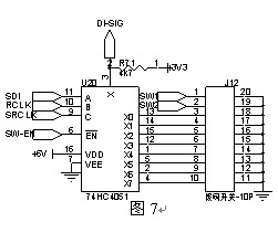 撥碼開關輸入電路用于設定本裝置的通訊地址、通訊波特率、數(shù)據(jù)格式等參數(shù),使用一個八選一模擬開關U20,對外部撥碼J12每一位進行動態(tài)掃描檢測,撥碼開關輸入和開關量輸入的控制總線為共用結(jié)構(gòu),此方式的優(yōu)勢是節(jié)約CPU的IO口線,缺點是程序處理稍復雜,需要使用動態(tài)掃描方式一路一路檢測(圖7)。