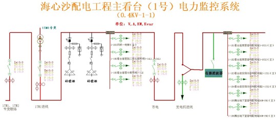 系統(tǒng)通過(guò)全中文界面,CAD圖形顯示高低壓配電系統(tǒng)一次主接線圖,顯示當(dāng)前各回路設(shè)備運(yùn)行信息,并實(shí)時(shí)刷新,并通過(guò)著色,顯示當(dāng)前回路運(yùn)行狀態(tài),如下圖所示: