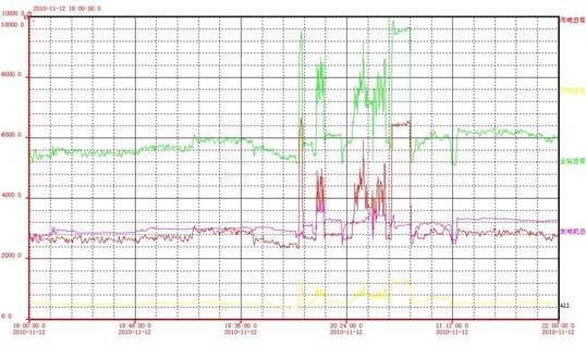 由于開(kāi)幕式當(dāng)晚對(duì)配電系統(tǒng)安全性要求極高,因此,在重要回路部分采用現(xiàn)場(chǎng)發(fā)電,保證配電系統(tǒng)運(yùn)行安全,穩(wěn)定。圖(四)中,大紅色曲線表示由廣州市供電局供電功率趨勢(shì)曲線,紫色部分為現(xiàn)場(chǎng)發(fā)電機(jī)發(fā)電功率趨勢(shì),綠色曲線表示當(dāng)前總功率運(yùn)行趨勢(shì),通過(guò)實(shí)時(shí)趨勢(shì)曲線,可以幫助值班人員密切監(jiān)視當(dāng)前負(fù)荷運(yùn)行狀況。